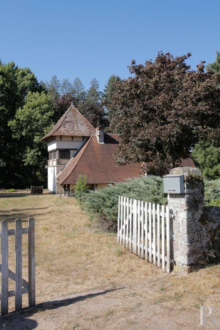 Depuis le couloir, un escalier en bois mène au dernier étage de la tour, qui comporte un bureau vitré de plus de 20 m², au sol couvert de carreaux en damier. En hauteur et au cœur des arbres, la vue est ouverte sur le parc et la nature environnante.