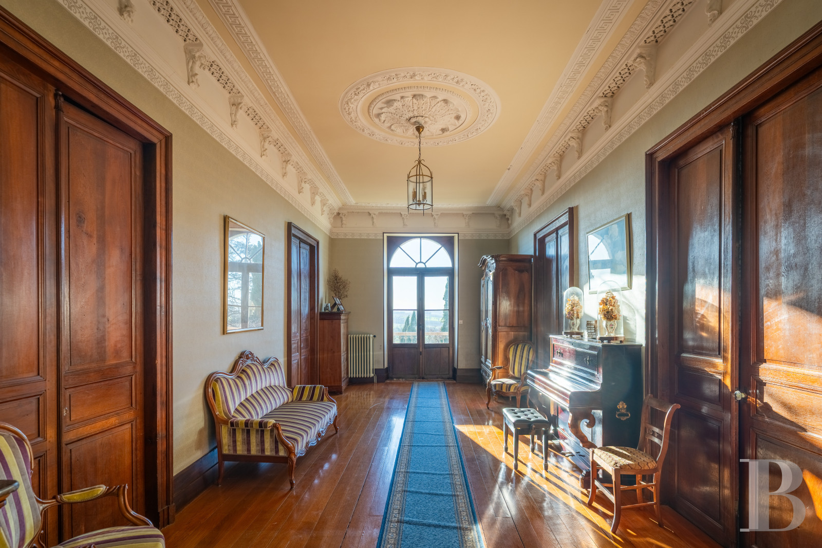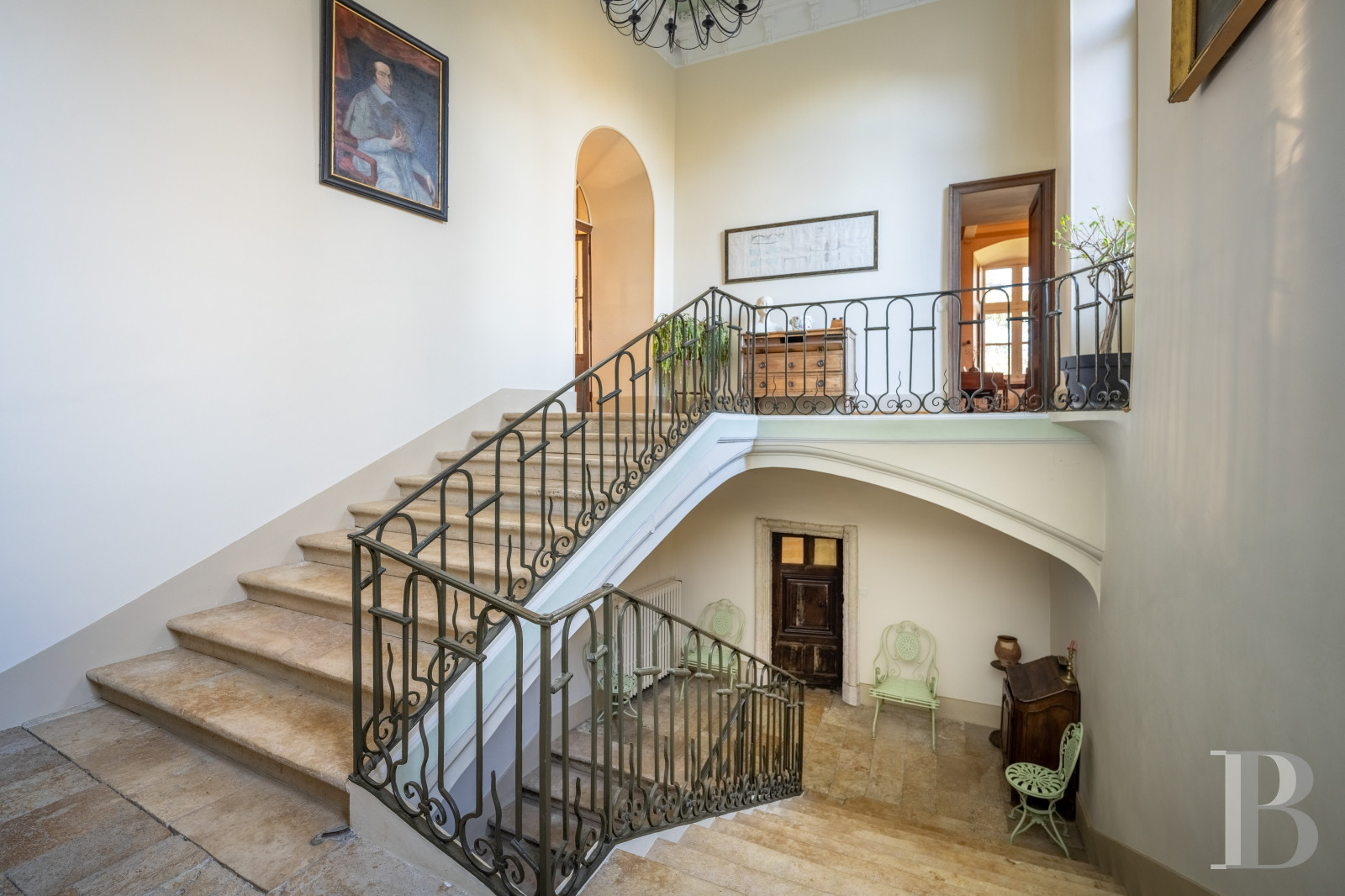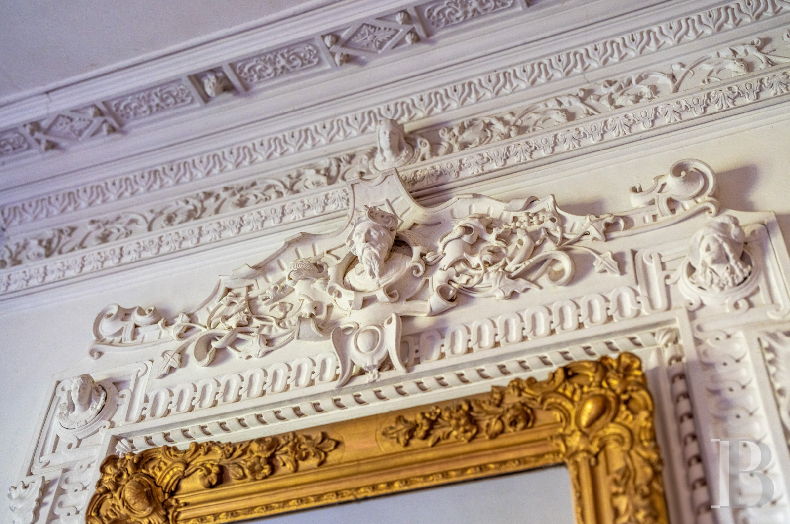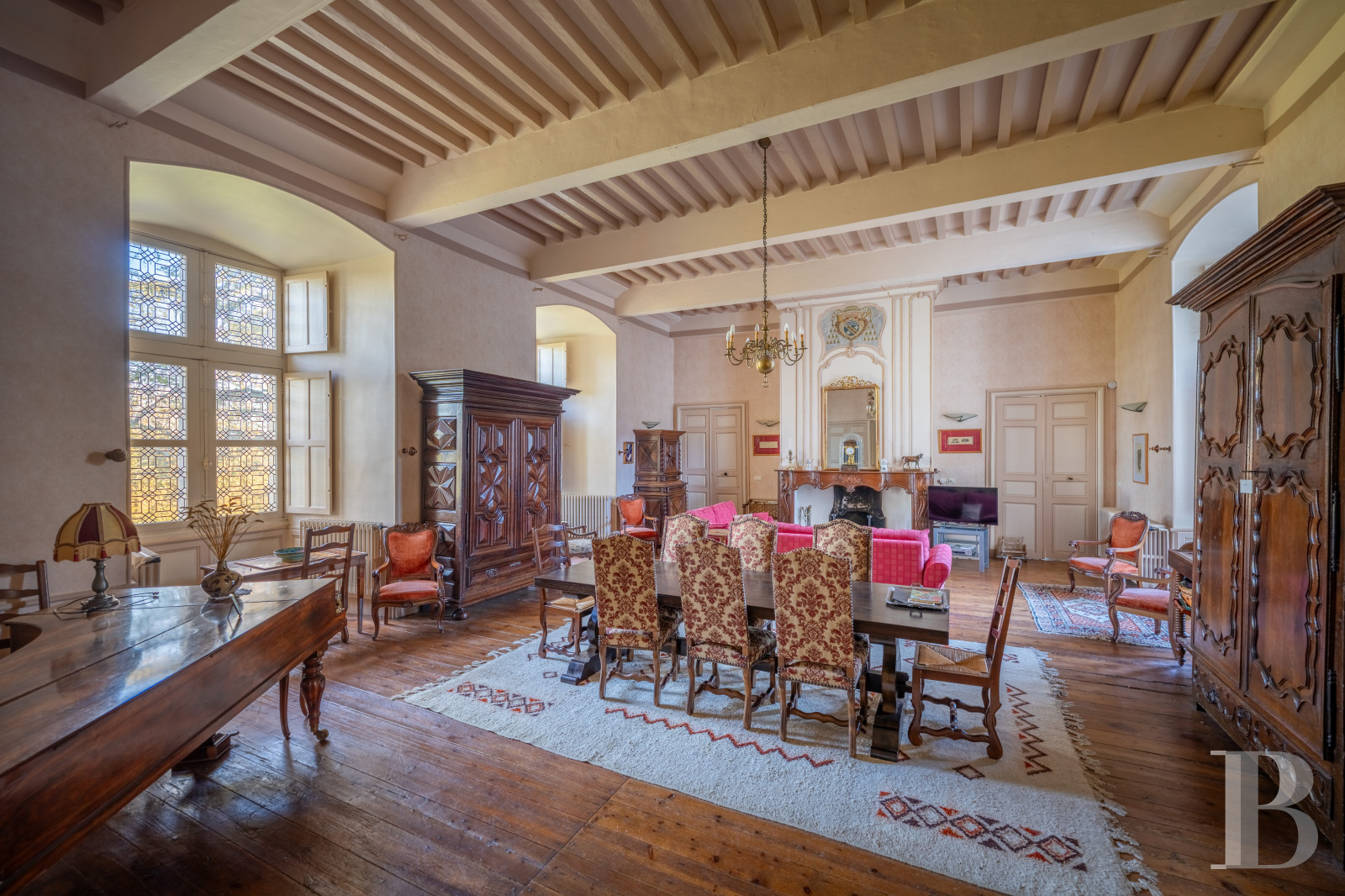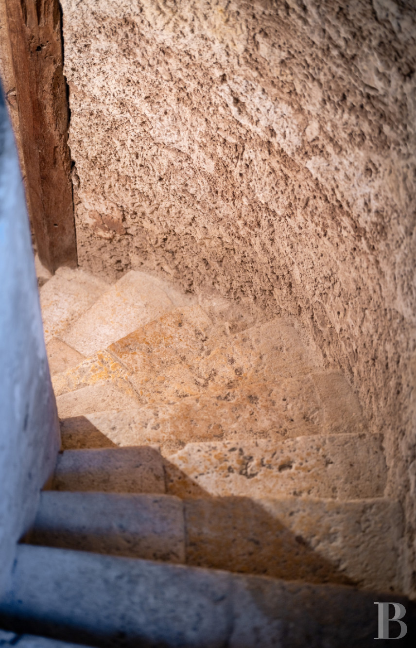 Une lourde porte en bois franchie, un escalier magistral en pierre se révèle. Il conduit au logis bourgeois divisé en deux parties distinctes. D'un côté, se tient le salon avec ses éléments préservés : moulures, fenêtres à meneaux, parquet massif et cheminée au manteau de bois sculpté. Dans son prolongement, une étroite cuisine équipée et un bureau. Ces deux pièces communiquent avec une vaste terrasse offrant une vue dégagée sur le parc. De l'autre côté, la partie nuit comprend quatre chambres à coucher, deux salles de bain et deux toilettes.