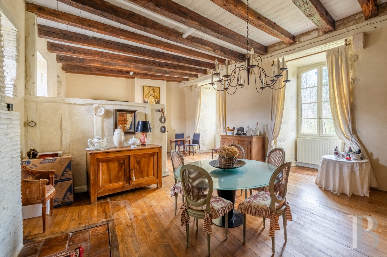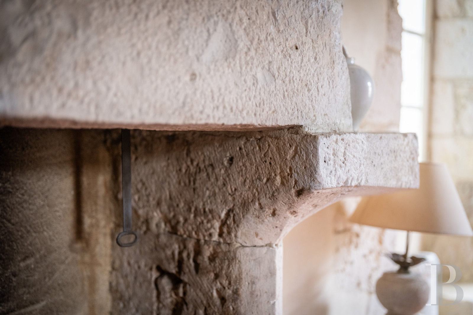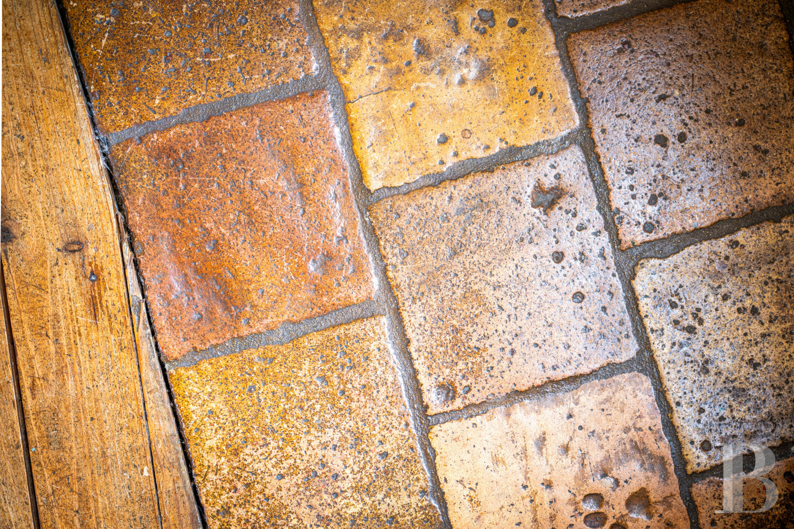 Un escalier de pierre conduit à une terrasse couverte qui précède l'entrée noble de la maison. La porte principale révèle un hall de réception au parquet ancien, antichambre d'où rayonne l'organisation des lieux. C'est depuis ce hall qu’est accessible le salon, pièce maîtresse de la demeure. Les hauts plafonds et leurs poutres de chêne sombre tracent leurs lignes au-dessus d'une cheminée monumentale en pierre. Les fenêtres à meneaux filtrent une lumière douce et mettent en valeur les amples volumes. Au même niveau, une chambre a conservé son parquet d'origine ; ses baies donnent sur le jardin. Elle pourrait aisément servir de seconde pièce de réception selon les besoins. Une salle à manger avec cheminée est ouverte sur une cuisine, ce qui permet à la pièce d’être doublement orientée sur la cour et le jardin, pour une continuité naturelle entre l'intérieur et l'extérieur. Une salle de bains aux lignes contemporaines, avec baignoire et double vasque, voisine un cabinet de toilettes séparé.