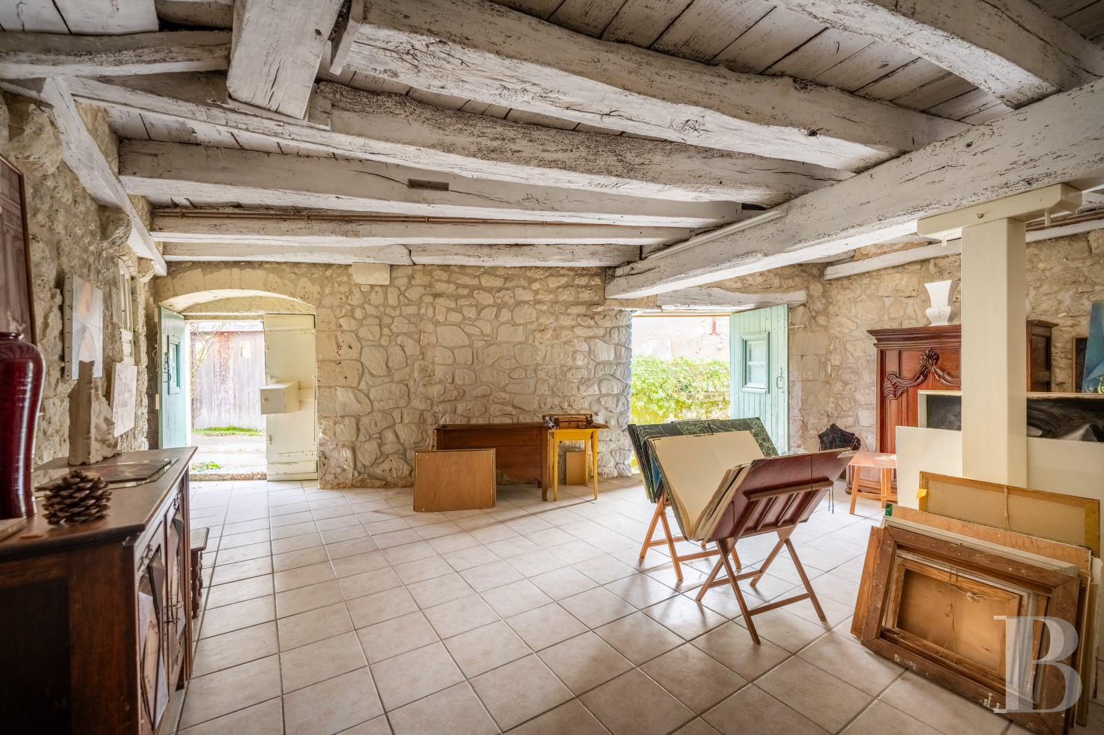 Depuis la cour, une porte donne accès à une vaste buanderie avec point d'eau, puis au jardin. Un atelier de peinture est accessible indépendamment depuis la cour, la rue ou par l'escalier intérieur du salon. Grande salle en pierre qui révèle les fondations médiévales de la maison, elle est suffisamment imposante pour y organiser des réceptions ou des expositions. Un cellier, accessible également depuis la cour, forme un espace de rangement complémentaire important. Un puits ancien y a été préservé. Une grange indépendante de 30 m², en pierre, donne un potentiel d'aménagement ou de stationnement supplémentaire.