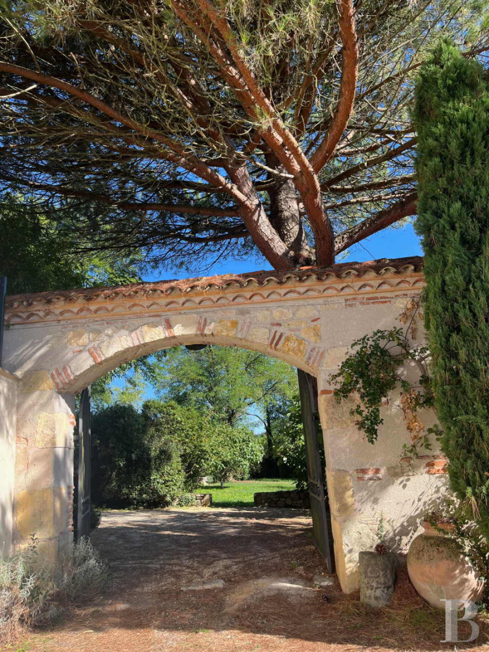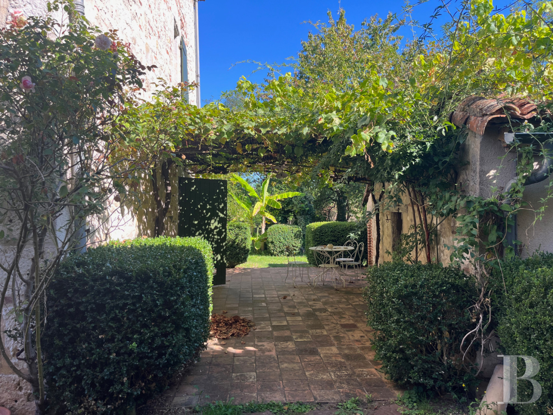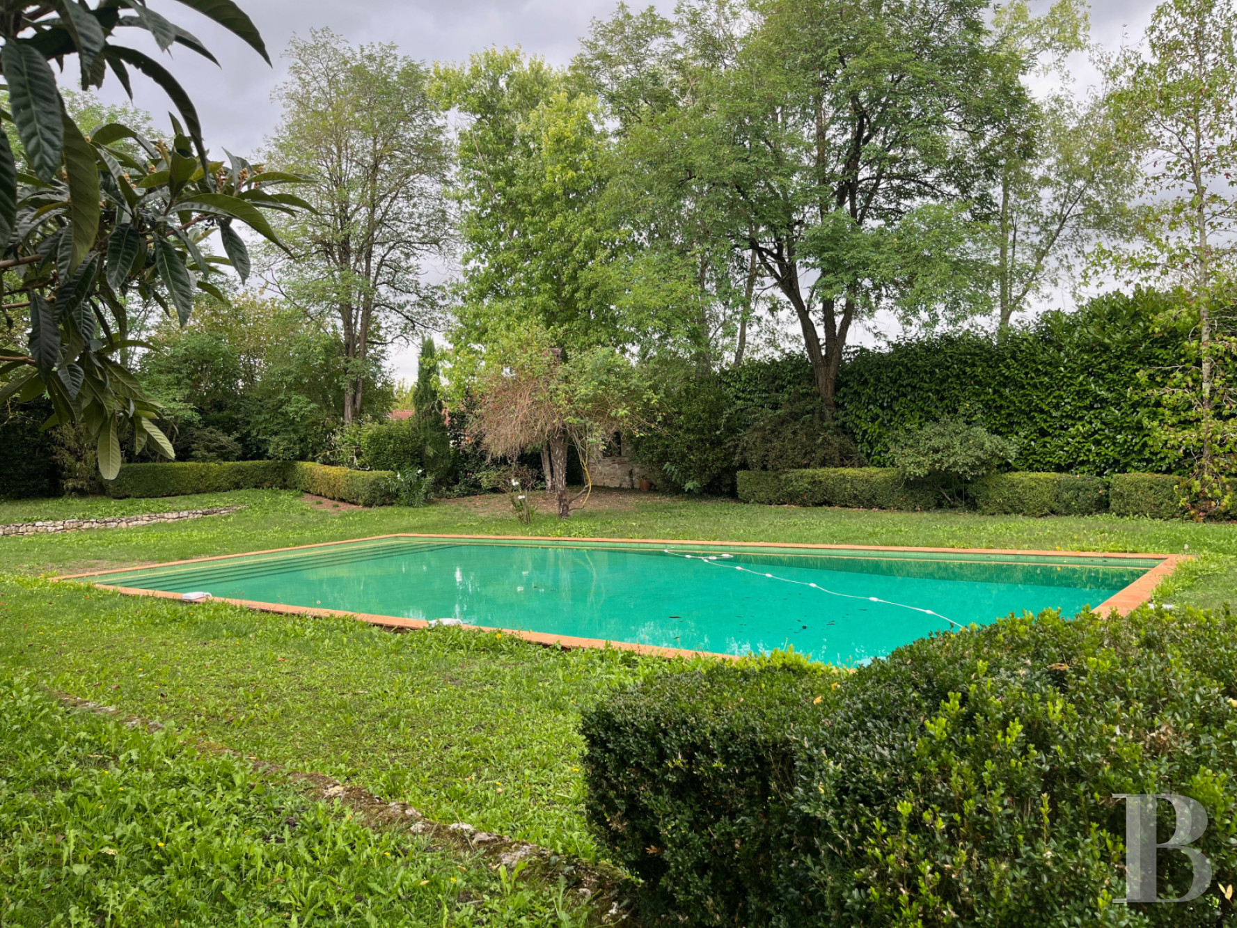 La propriété se déploie sur plus de 35 ares de terrain arboré et protégé des regards. L'accès se fait par un imposant portail en fer forgé, enchâssé entre deux piliers massifs coiffés de tuiles canal. Un imposant pin parasol, aux branches largement déployées, fait sentinelle à l'entrée. Une aire de stationnement spacieuse accueille plusieurs véhicules. Le jardin, dessiné à l'anglaise, laisse s'épanouir librement cerisiers, pommiers, pruniers et figuiers. Quelques bananiers apportent une note d'exotisme inattendue. Cèdres, épicéas et cyprès structurent l'espace de leur verticalité solennelle, tandis que saules pleureurs et bambous accompagnent la promenade. Au centre du jardin, un puits ancien est encore visible. Non loin, une piscine s'insère adroitement dans la prairie. Ses dimensions généreuses et ses margelles de pierre lui donnent autant d'élégance que d'intérêt sportif. Pour les enfants, une cabane jouxte un portique de bois.