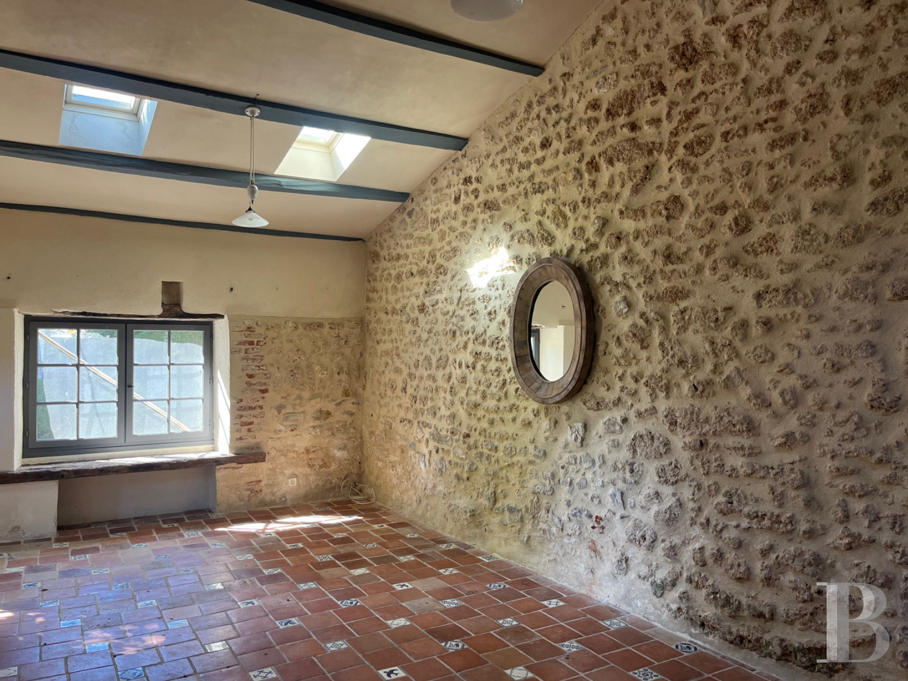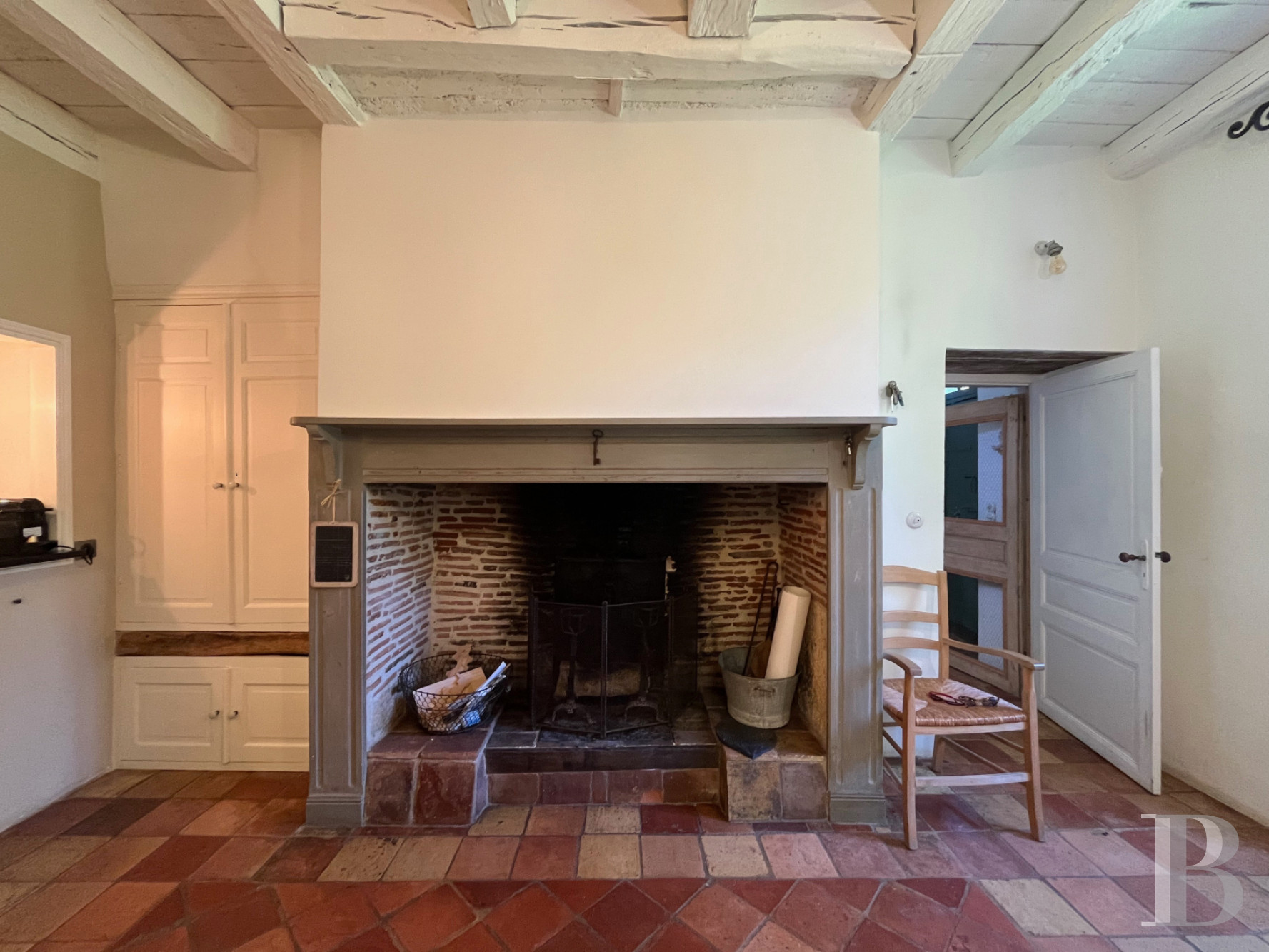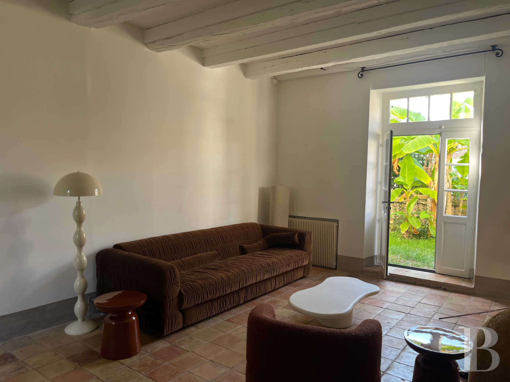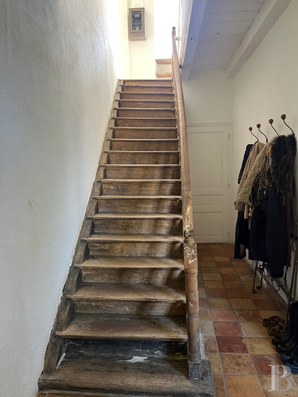 Derrière la façade septentrionale de la maison, un hall d'entrée, sobre et lumineux, dessert l'ensemble des pièces de réception tandis qu'un escalier en bois patiné s'élève vers les étages. Sous l'escalier, des toilettes et des zones de rangement ont pris place. D’un côté de l'entrée, le salon déploie ses volumes généreux sous un plafond à la française. Les hautes fenêtres à carreaux ouvrent sur la verdure. De l’autre côté, une cuisine avec coin repas a conservé son atmosphère rustique avec ses tomettes anciennes et ses murs peints à la chaux. Elle communique avec une arrière-cuisine et avec une terrasse couverte d'une treille, où le sol pavé de terre cuite dialogue avec les pierres apparentes des murs.