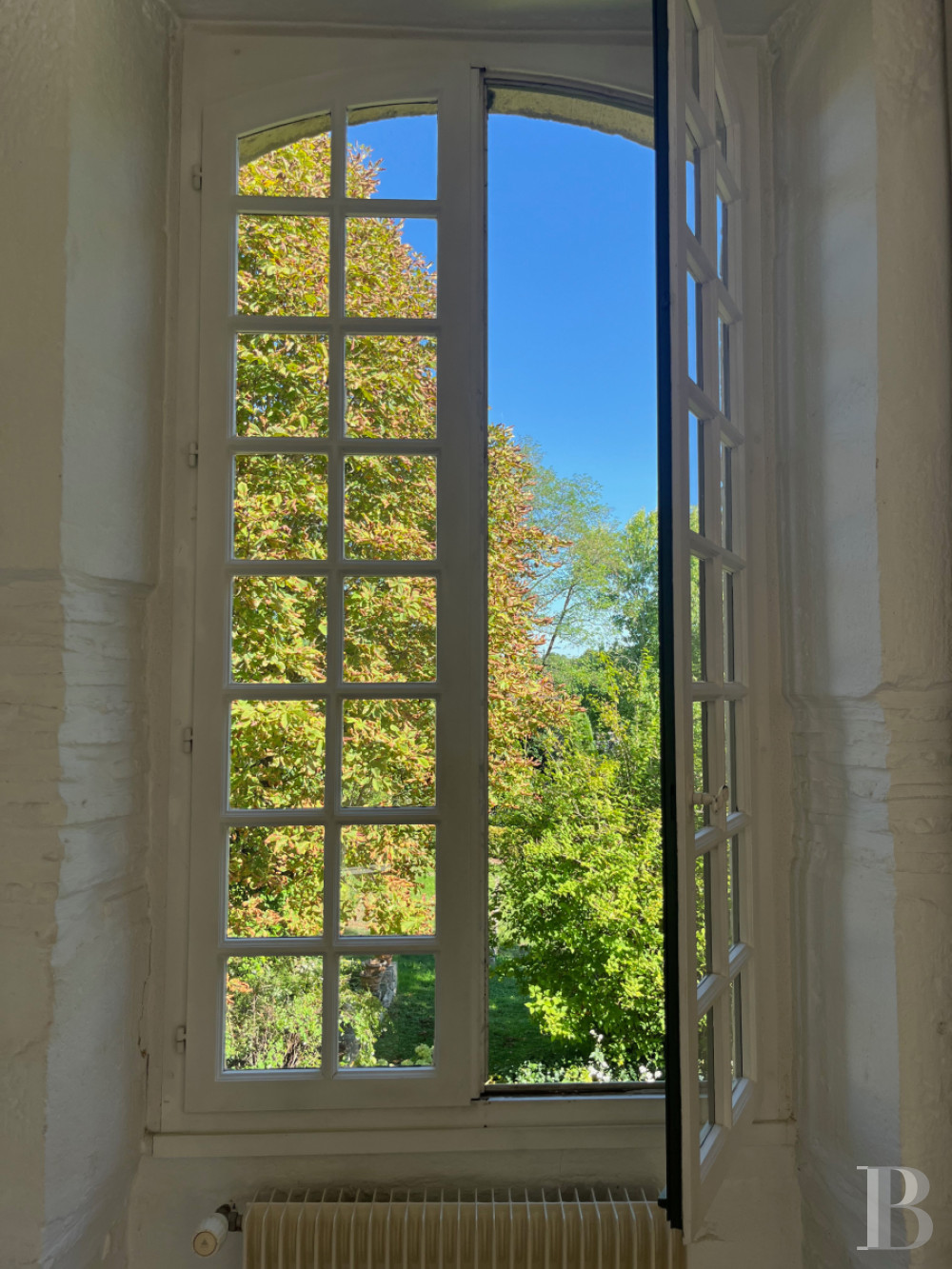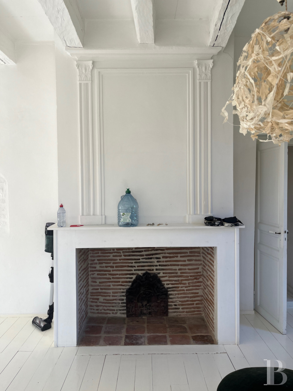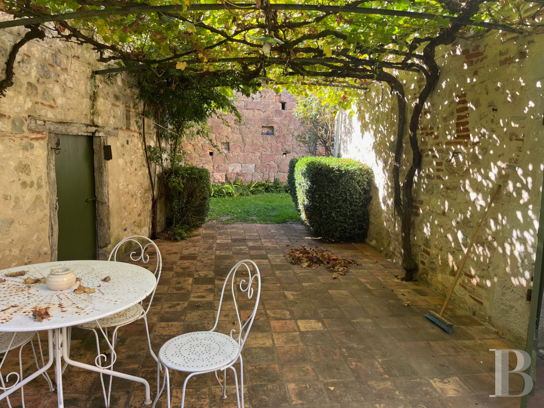 La façade dévoile son appareil mixte de pierre blonde et briques foraines, rythmé par de hautes baies à impostes cintrées doublées de volets peints de couleur céladon. La porte d'entrée, encadrée de montants patinés par le temps, ouvre sur des volumes généreux où règne une lumière filtrée par les frondaisons alentour. À l'intérieur, les carreaux de terre cuite, inégaux et usés, témoignent de décennies d'usage. Les murs enduits à la chaux respirent sous les poutres apparentes qui soulignent la simplicité des volumes. Quelques éléments de menuiserie ancienne subsistent, dans une atmosphère austère mais conviviale, propre aux demeures presbytérales. La cour pavée, installée entre les murs de la maison, de la dépendance et fermée par le mur de l'église, s’étend sous une treille, face aux pierres veinées d'ocre et de rose.