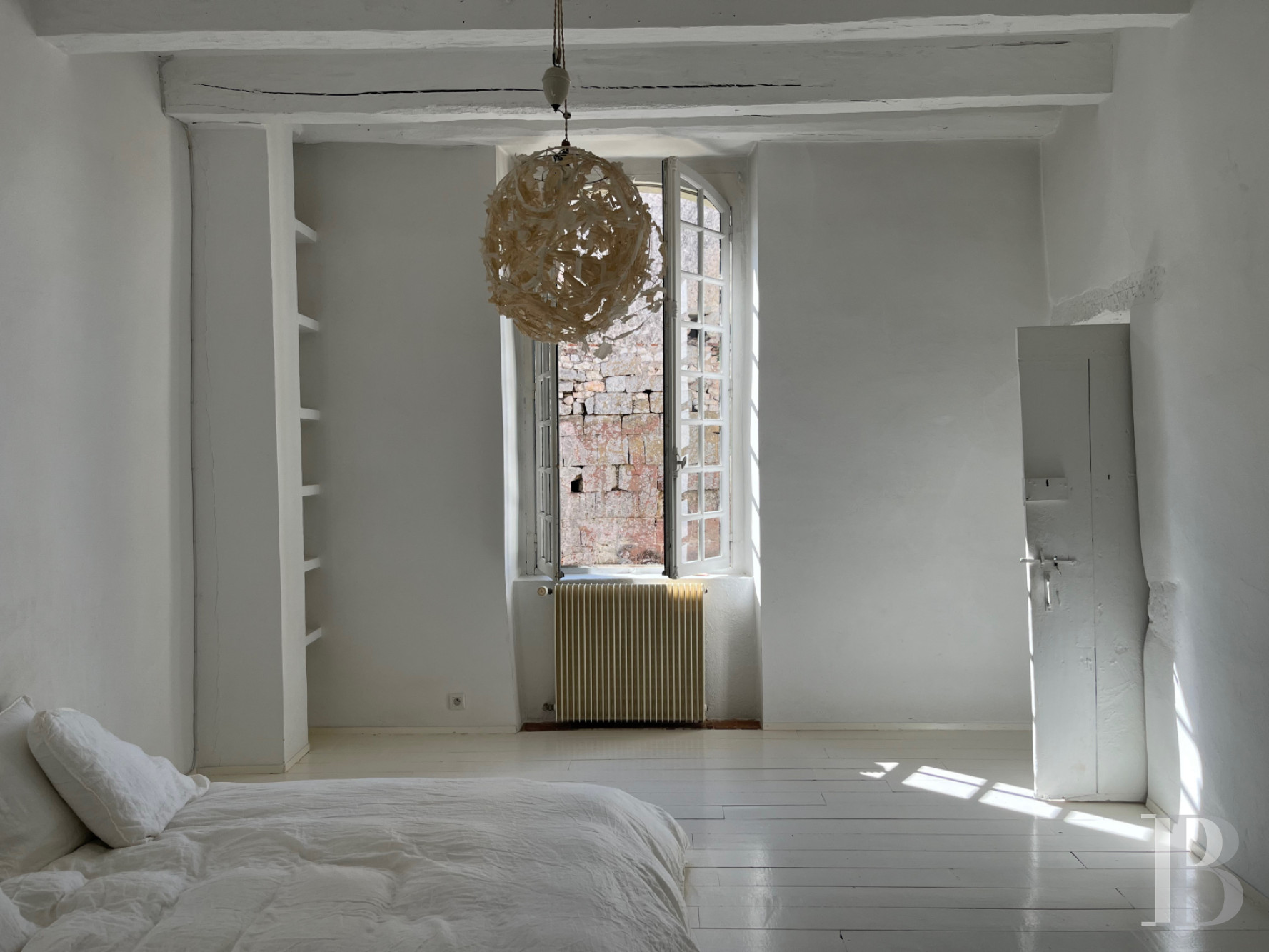 Deux bâtiments annexes, aménagés en suites indépendantes, complètent l'offre de couchage. Chacune compte une chambre sobre aux volumes bien proportionnés, une salle d'eau fonctionnelle et une terrasse privative tournée vers le jardin. L'une d'elles se caractérise par une une cheminée en pierre dont le manteau est sculpté. Les sols de tomettes anciennes contrastent avec les murs enduits à la chaux. Ces espaces autonomes préservent l'intimité de leurs occupants et promettent de multiples possibilités d'usage : accueil d'amis, location saisonnière ou logement pour une famille élargie.