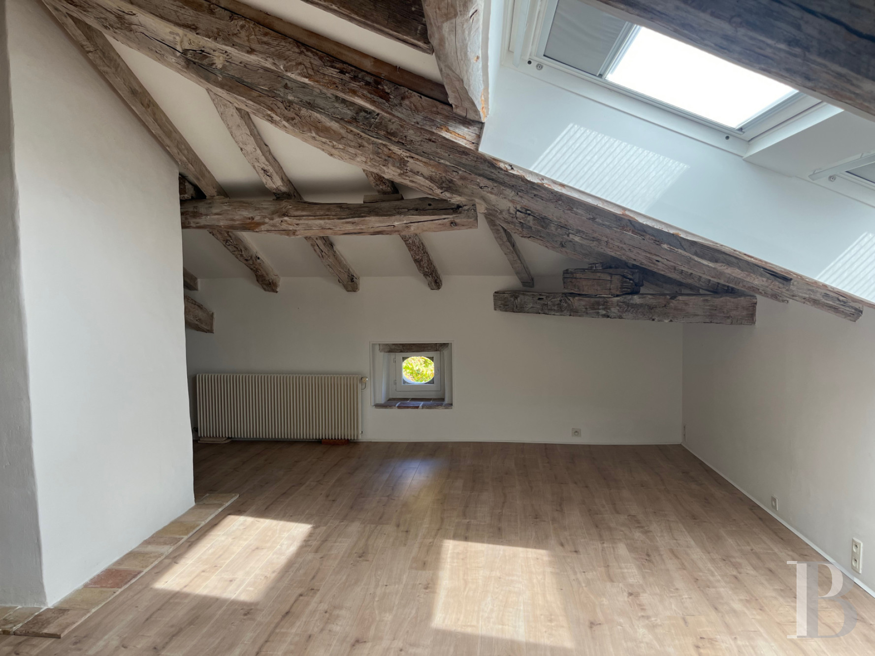 Sous les combles, il révèle toute la noblesse de sa charpente ancienne. Les imposantes fermes de chêne, aux sections généreuses et assemblages à tenons mortaises, dessinent une géométrie spectaculaire. Deux chambres mansardées y sont baignées d'une lumière zénithale, leur plancher est couvert d'une épaisse moquette. Elles se partagent une salle d'eau commune. Dans le grand espace commun, le sol est parqueté. À la fois salle de travail, de jeux, de couchage occasionnel, il représente un potentiel d'aménagement supplémentaire pour qui souhaiterait exploiter pleinement le volume.