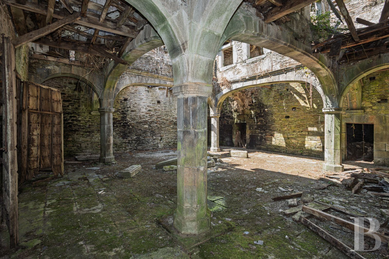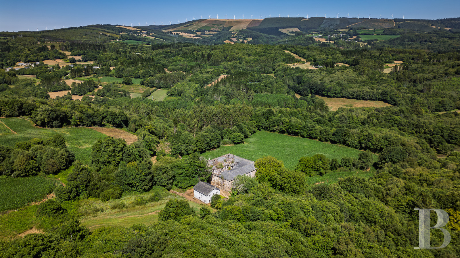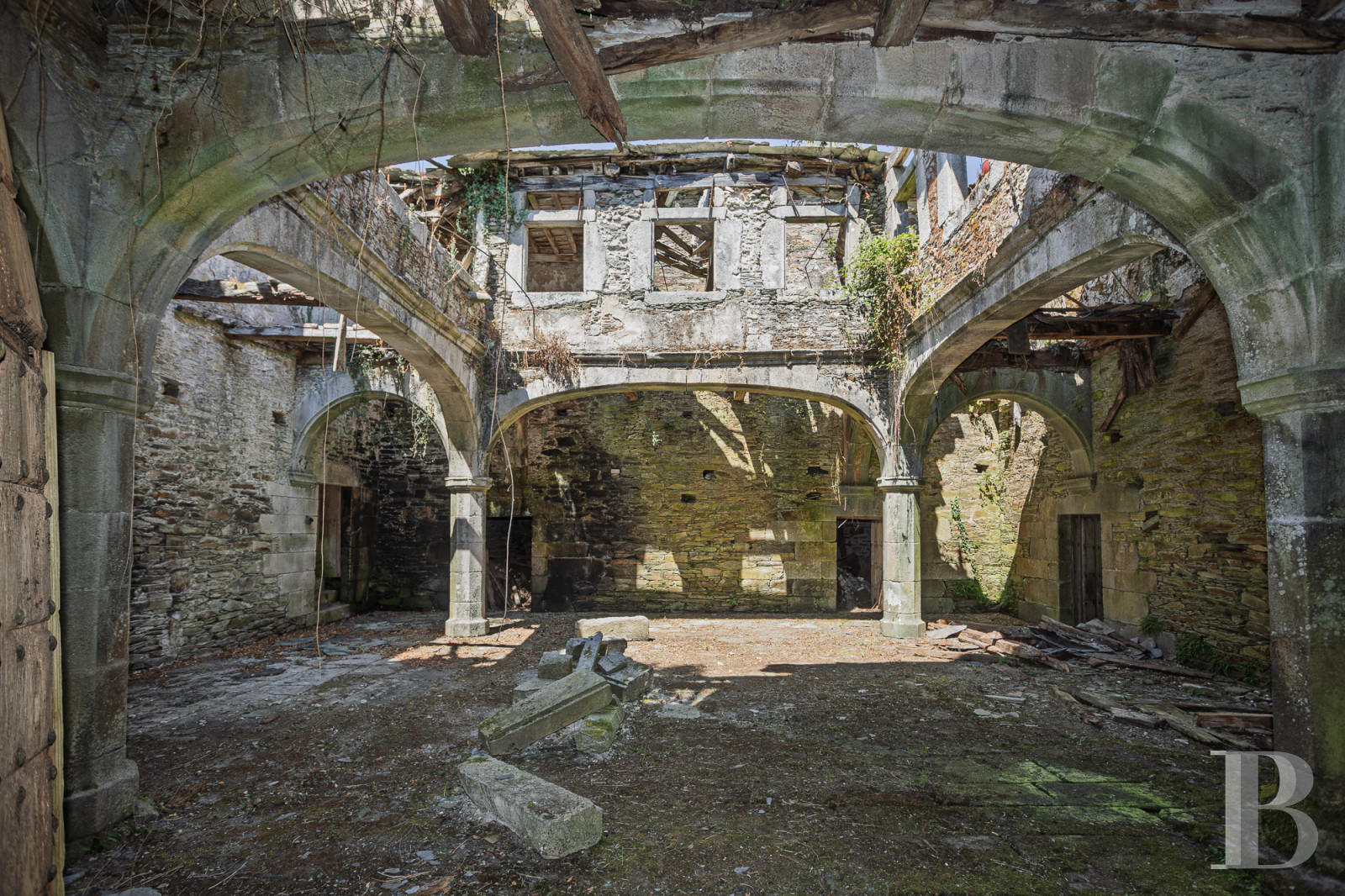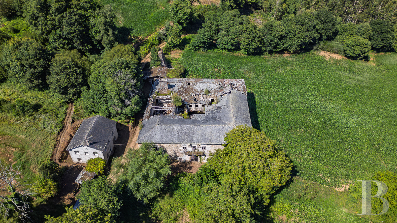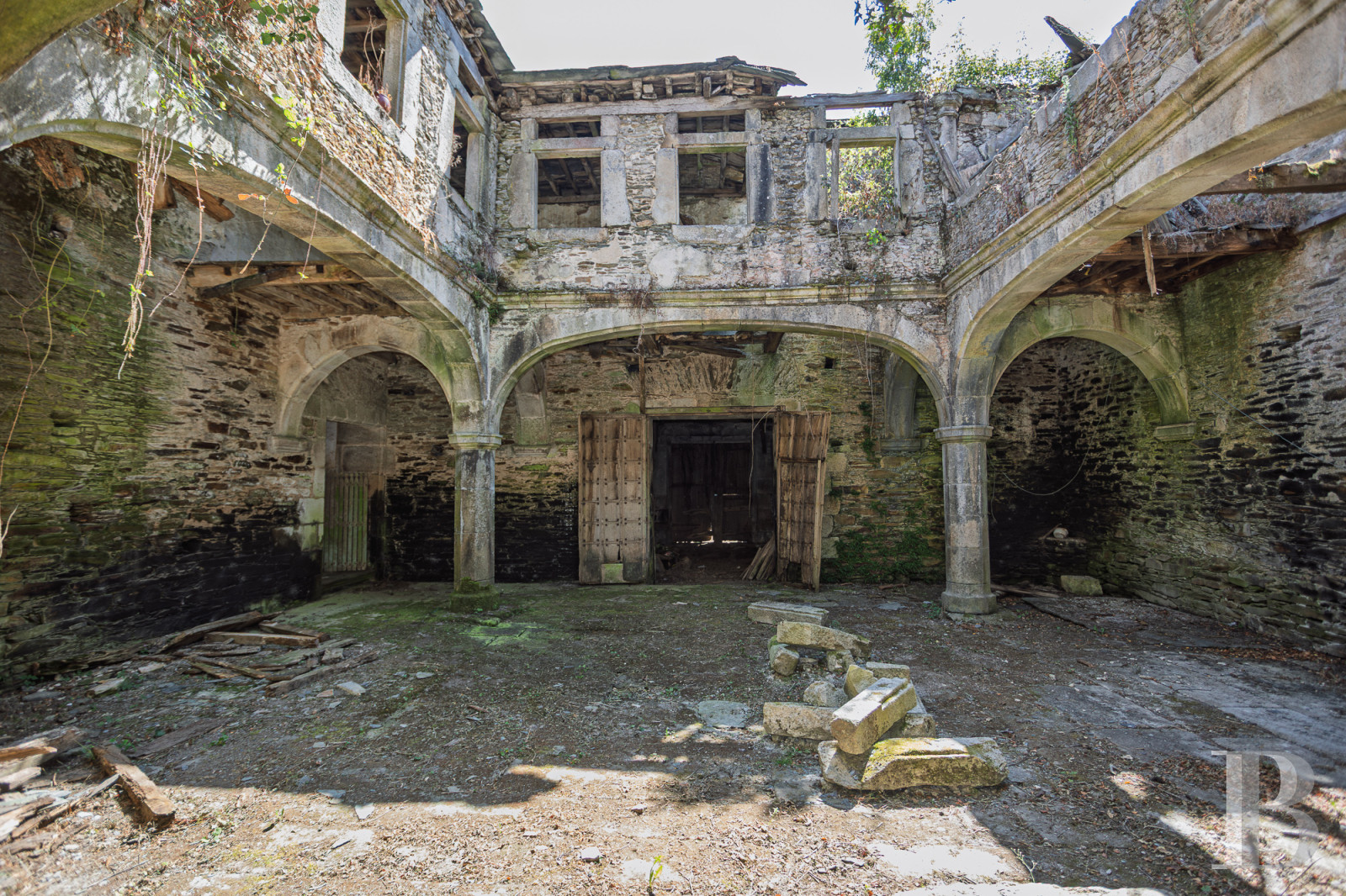 Les premières mentions de cette demeure seigneuriale remontent à 1660, lorsque le domaine appartenait au puissant lignage Osorio-Santiso. Les armoiries sculptées dans la pierre, couronnées de marques nobiliaires, témoignent d'une histoire de batailles et de seigneuries galiciennes. Le pazo principal, d'environ 2 000 m², révèle une cour intérieure de 200 m² entourée d'arcades de pierre d'une grâce exceptionnelle. Bien que nécessitant une restauration intégrale, les murs de pierre demeurent solides et les éléments d'origine attendent de retrouver leur splendeur. Une seconde habitation moderne, un lavoir de pierre et un alpendre avec four traditionnel complètent l'ensemble, à 23 km de Lugo, ville patrimoine mondial de l'UNESCO. Un héritage architectural où s'écrira un nouveau chapitre d'histoire.