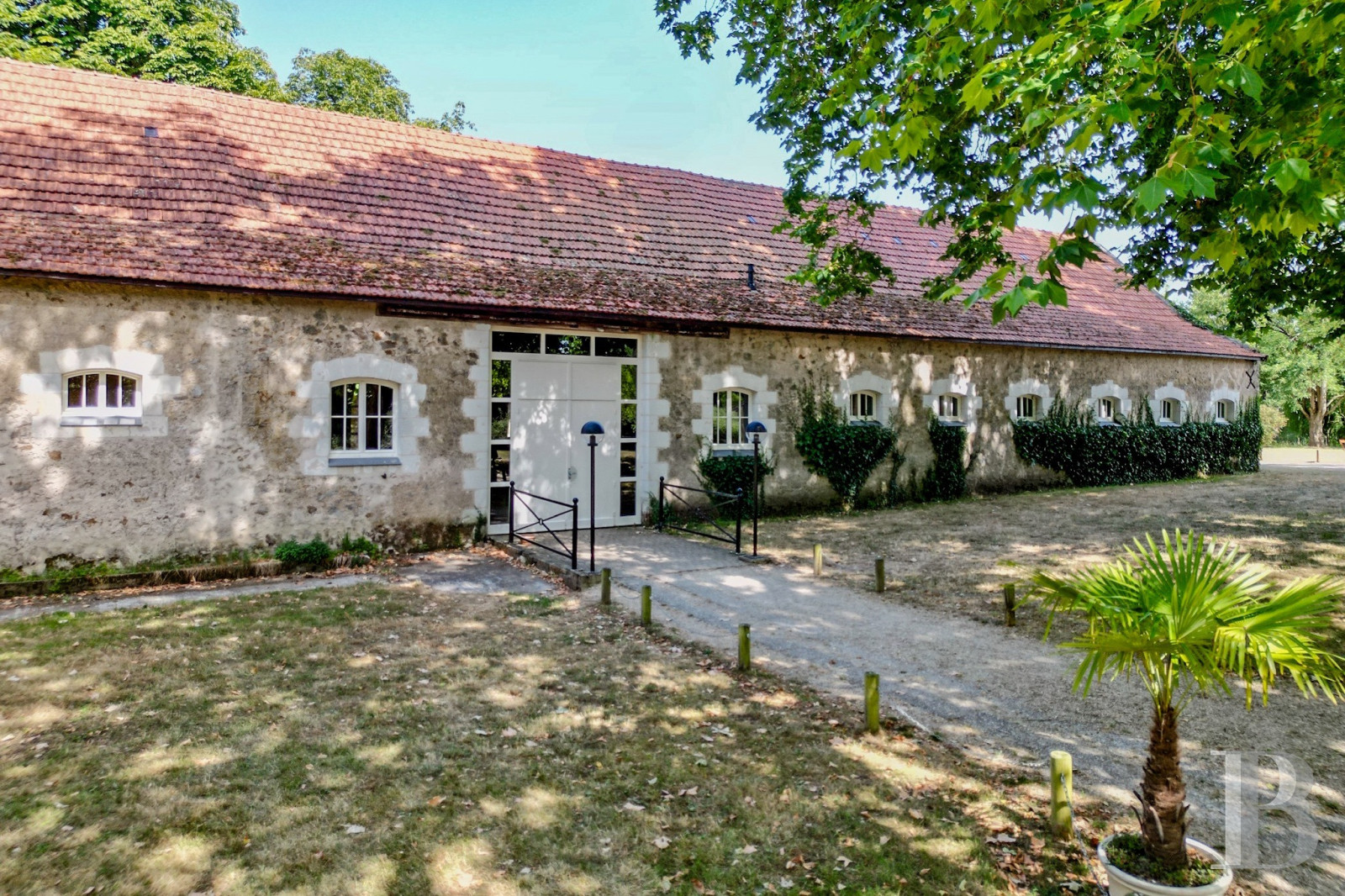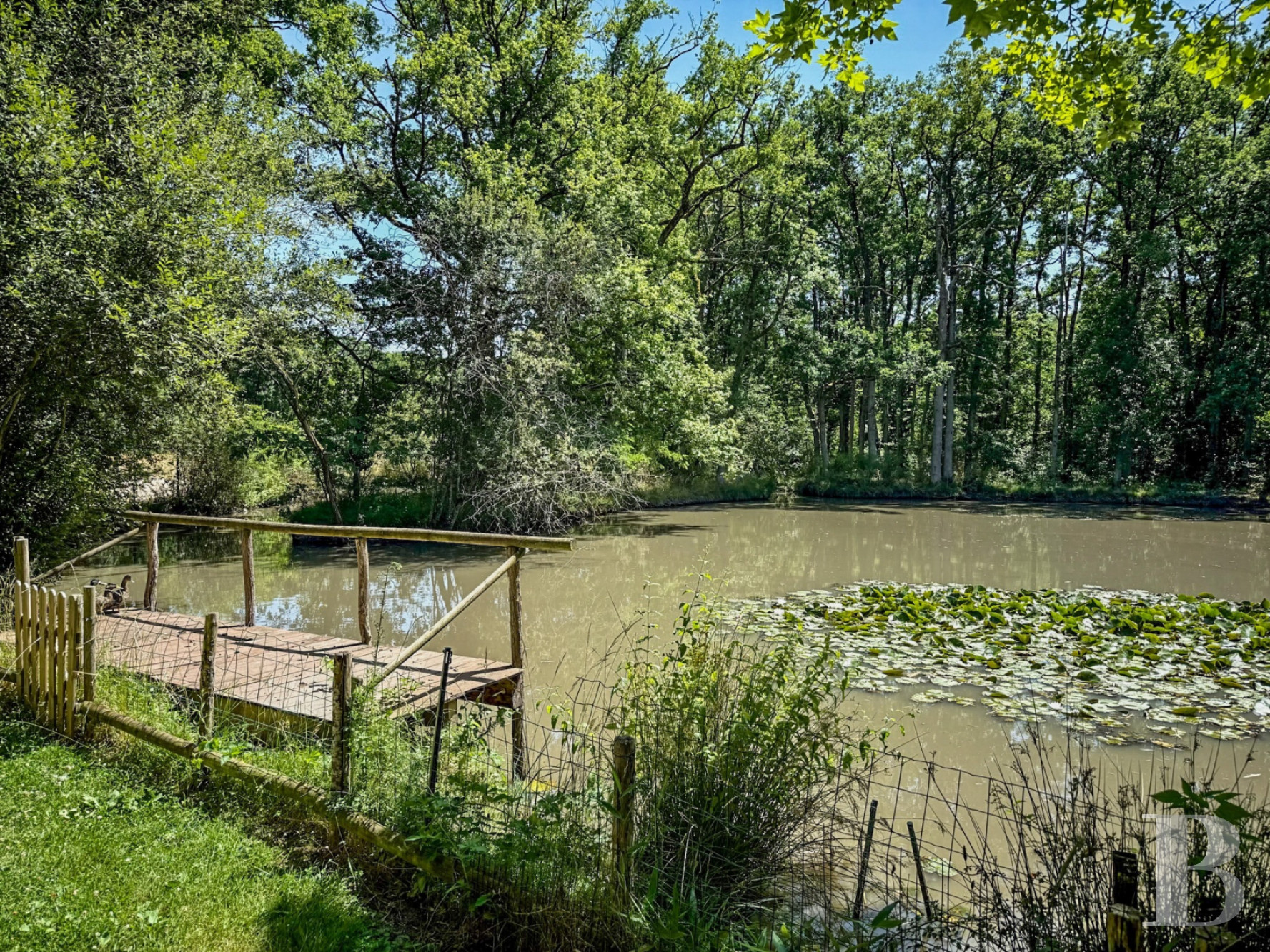 Au centre des bâtiments, une allée de marronniers abrite un espace enherbé propice aux déjeuners champêtres. En contrebas, le long de l'allée de platanes, une prairie sert de pâturage pour les ânes. Plus au nord, à proximité de la halle, un vaste étang poissonneux ouvre un accès vers la forêt.