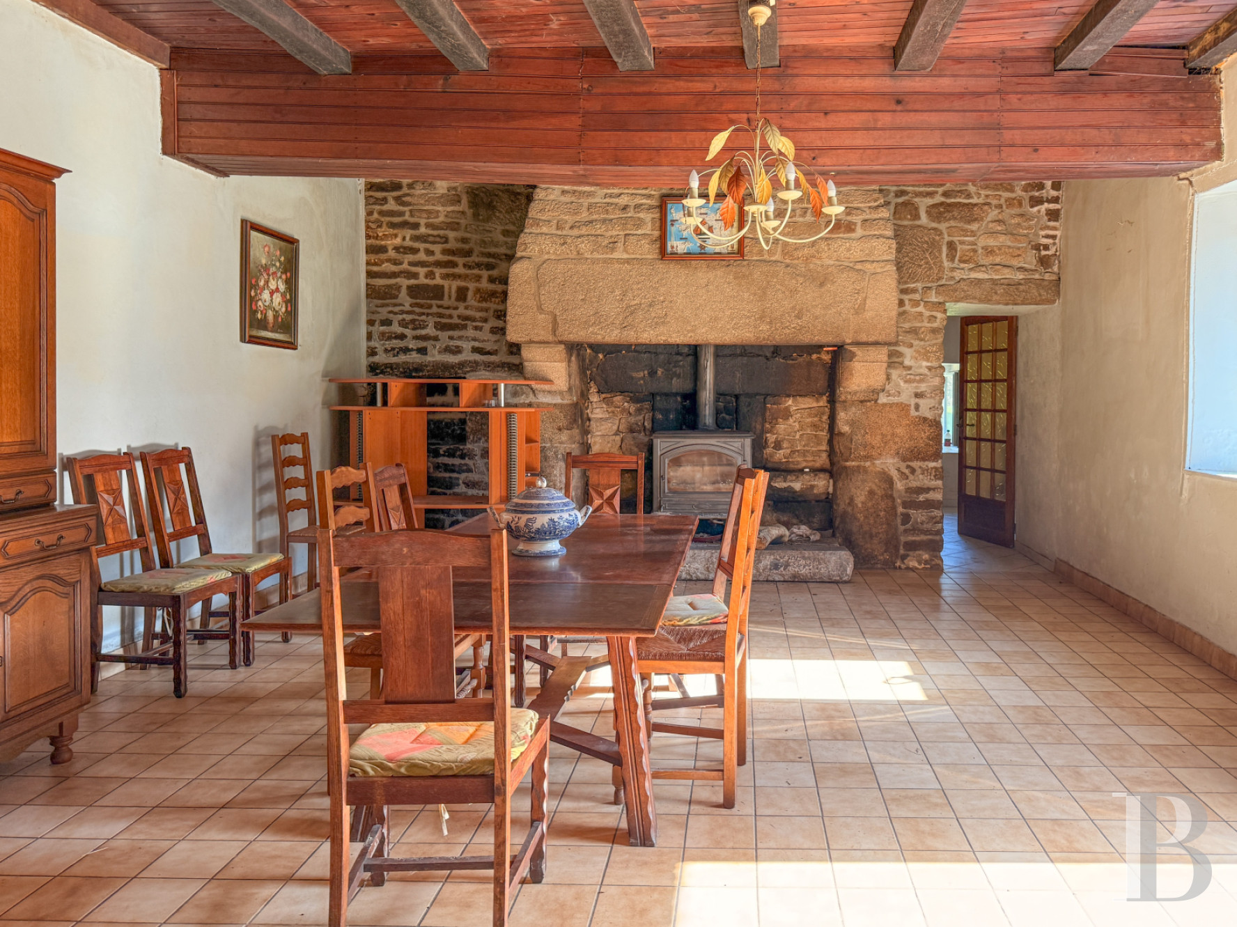 Il s’organise autour des pièces de vie traditionnelles. La salle de séjour, traversante, conserve un caractère rustique affirmé avec ses solives apparentes, son sol carrelé et une large cheminée de pierre dont le manteau massif encadre le foyer. L’espace peut recevoir une grande table familiale et bénéficie d’une ouverture vers l’extérieur qui apporte une lumière latérale.La cuisine, attenante, présente un aménagement simple, autour d’un espace de repas et d’une cuisinière à bois. Les murs enduits et les poutres visibles rappellent l’esprit domestique d’une maison de campagne restée proche de son usage d’origine. Une salle de bain avec douche ainsi que des toilettes, avec carrelage au sol et faïence murale, éclairée par une fenêtre haute, sont aménagées en retour d’équerre. Une pièce supplémentaire pourrait faire office de chambre.
