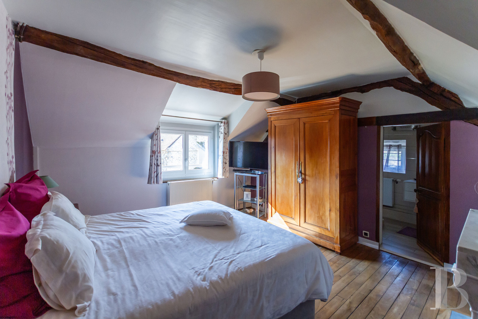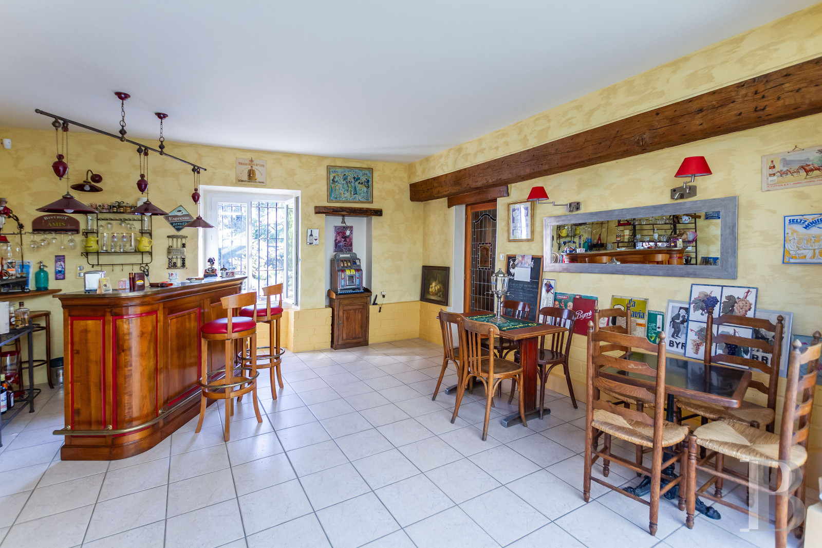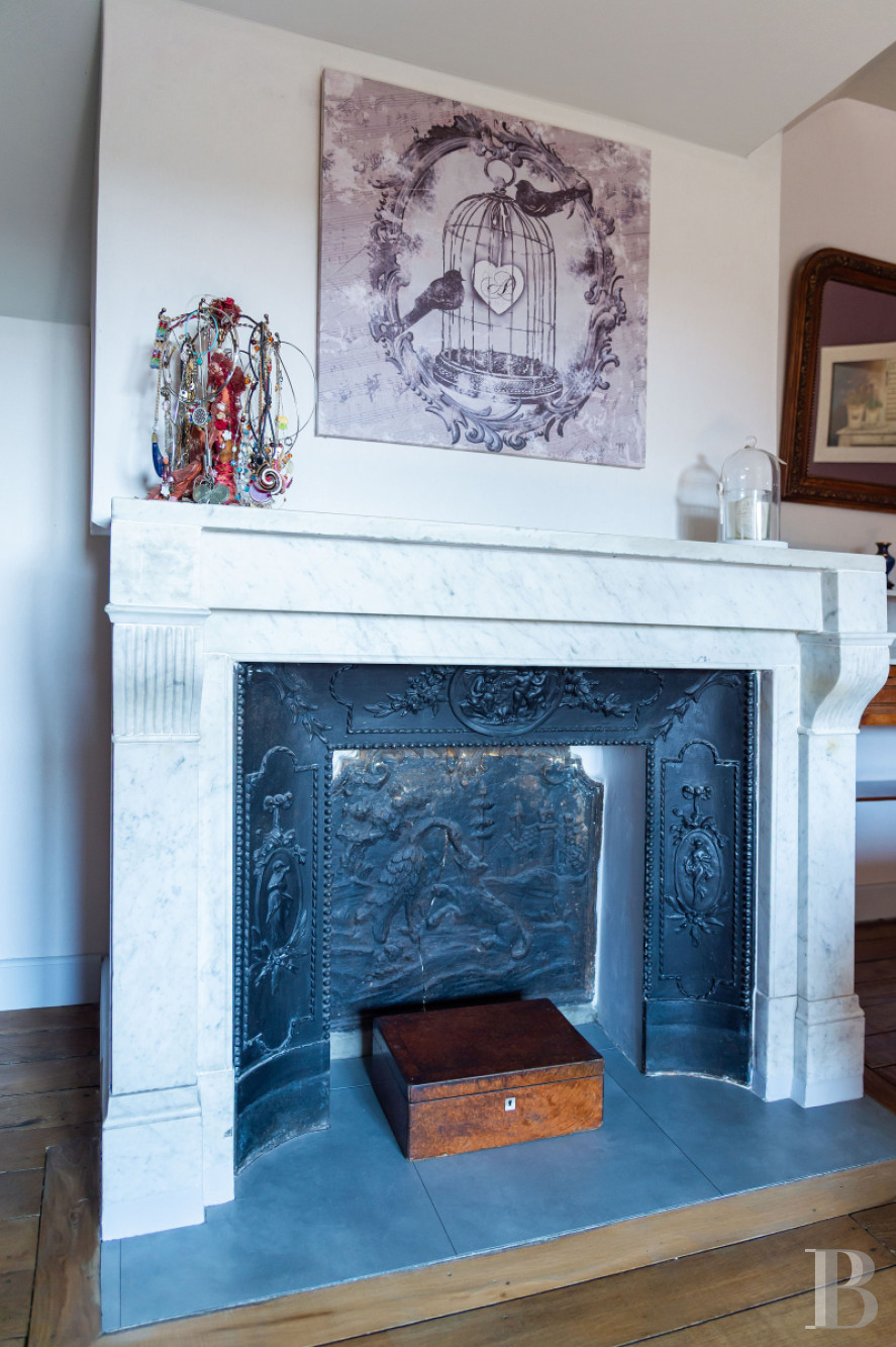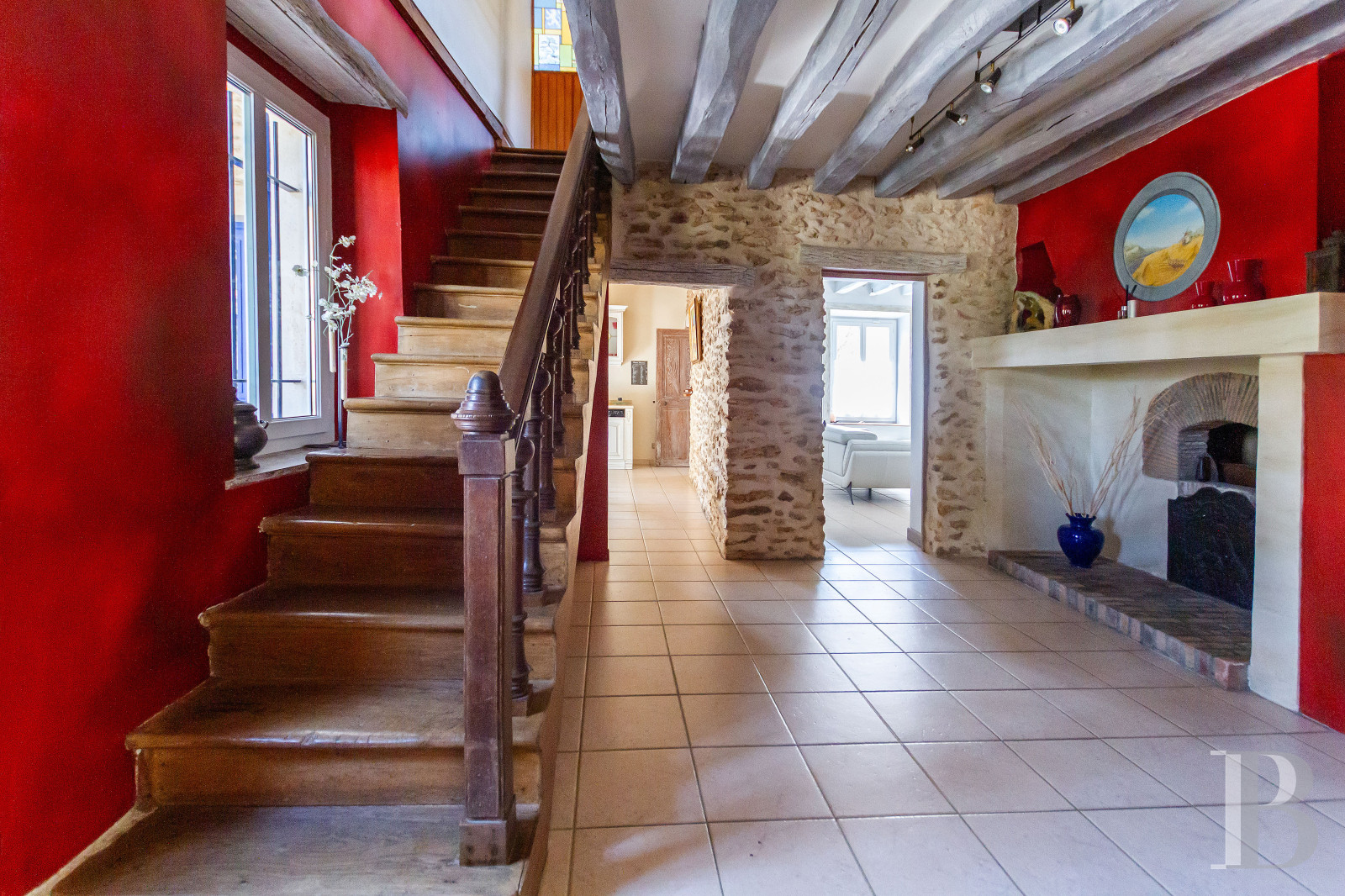 Le rez-de-chausséeUn vestibule central distribue les espaces, aux côtés d’un escalier en bois massif. La rénovation a tout fait pour mettre en valeur les éléments anciens et faire ressortir le caractère authentique des lieux : murs en pierre apparente, solives et planchers blanchis, ancien four à pain conservé. D’un côté du vestibule, une cuisine s’organise autour d’un îlot central et associe mobilier en bois clair et piano de cuisson rouge. Dans son prolongement, une pièce technique communique avec un bureau à l’étage par un escalier indépendant. À l’opposé, un salle de séjour d’environ 75 m² s’ouvre largement sur le jardin grâce à une grande baie vitrée et une verrière. Un bar prend place côté cour, à proximité d’un cellier accessible également depuis l’extérieur. À l’articulation de la salle de séjour et de la cuisine, un salon équipé d’un poêle en céramique compose un espace plus intime. Les sols dallés de grès assurent une continuité minérale, tandis que la salle de séjour est pavée de pierre de Bourgogne. À l’extrémité de la maison, près de la grange, une grande pièce aménagée en bureau est aussi accessible par une entrée indépendante. Elle reste reliée à l’étage par un troisième escalier.