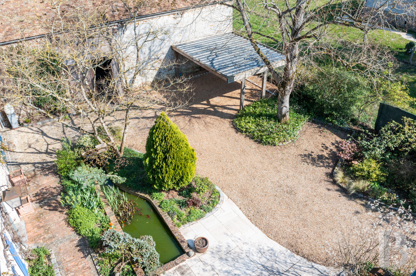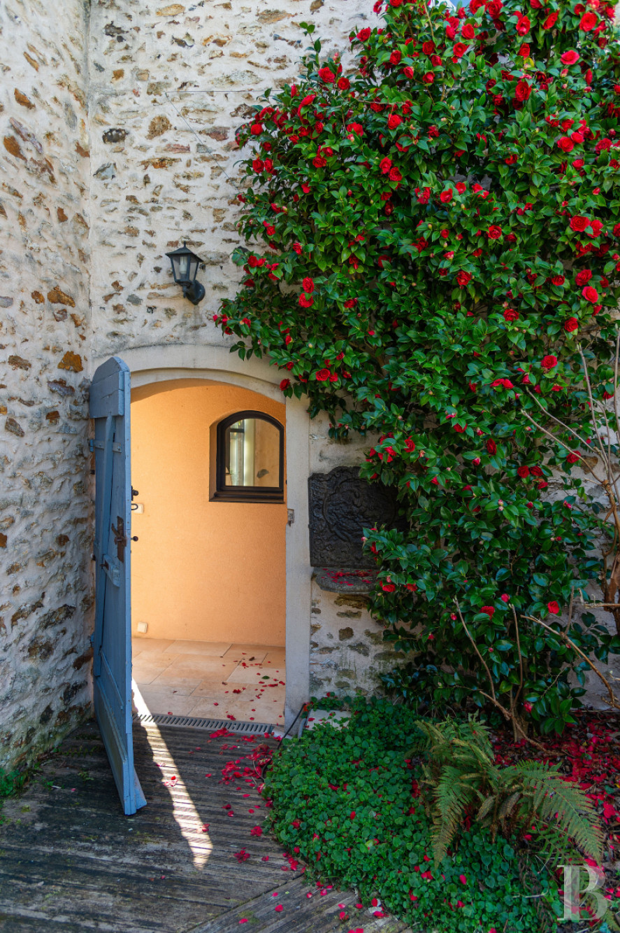 Construite en pierre de pays et couverte de tuiles plates à deux versants, elle donne à la fois sur la cour et sur le jardin. Elle développe une surface au sol d’environ 115 m², complétée par une mezzanine, sous hauteur de plafond de près de 8,40 m.La maison d'amis