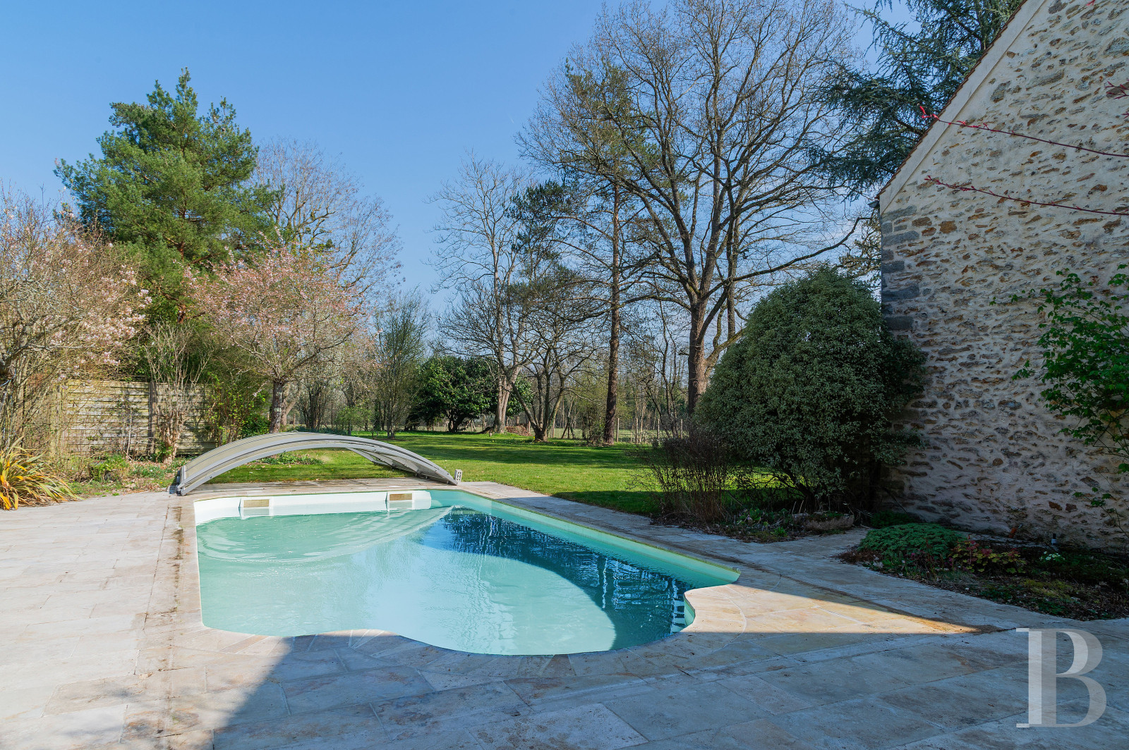 Chauffée par pompe à chaleur, elle mesure 4 x 9 m. Elle est protégée par un abri semi-haut composé d’arceaux en aluminium anodisé et de panneaux en polycarbonate. Les plages en pierre calcaire structurent les abords.Ce que nous en pensons