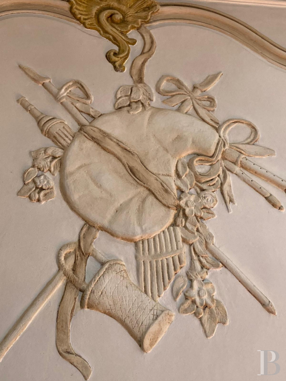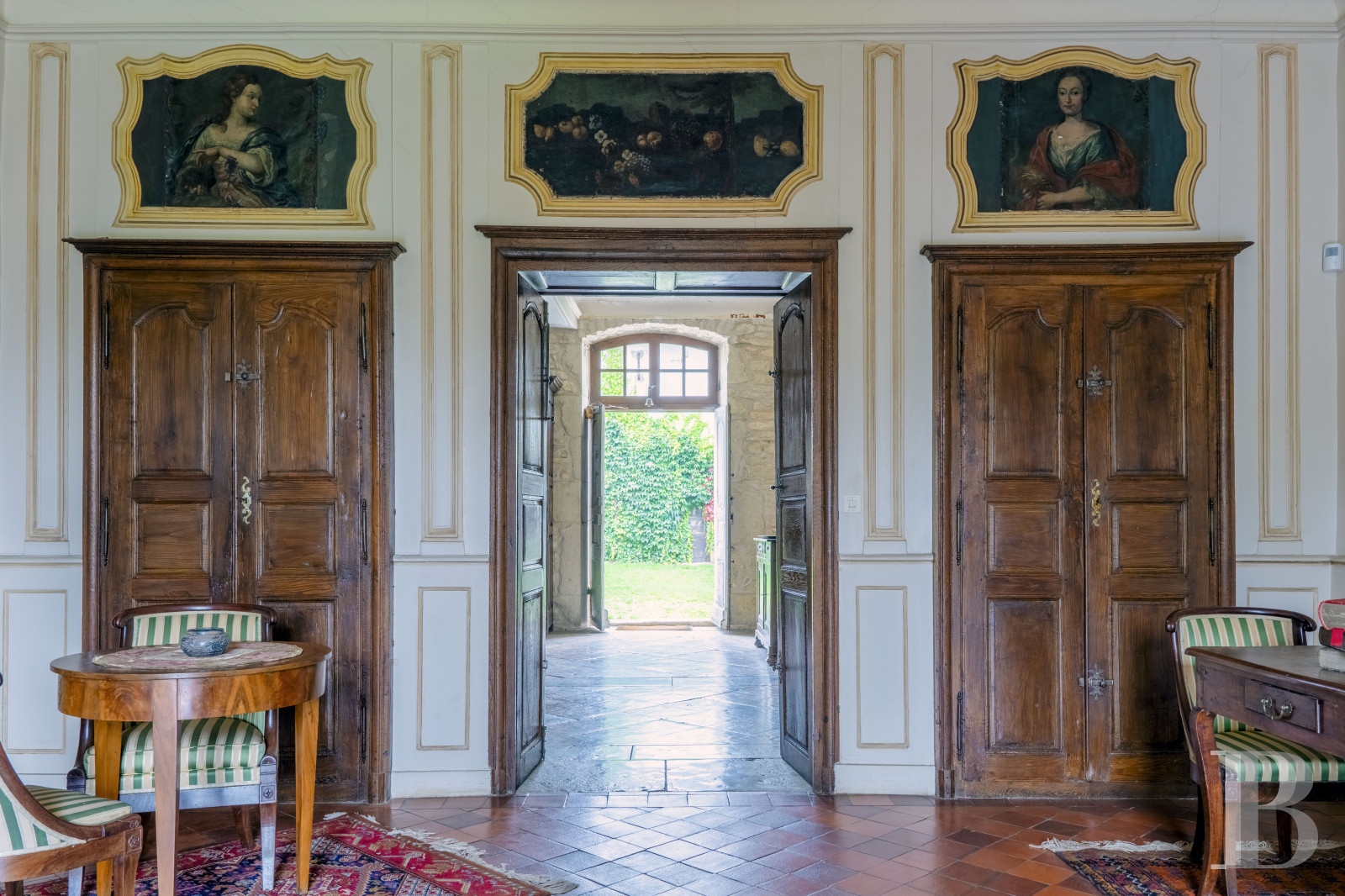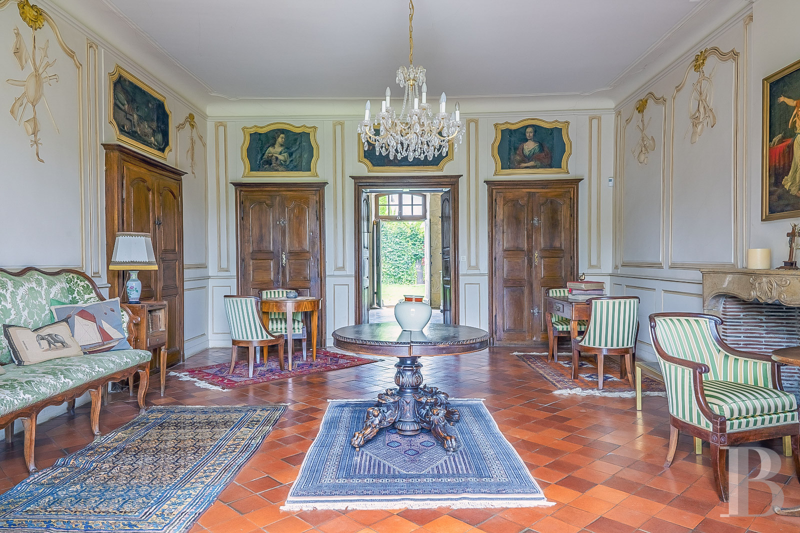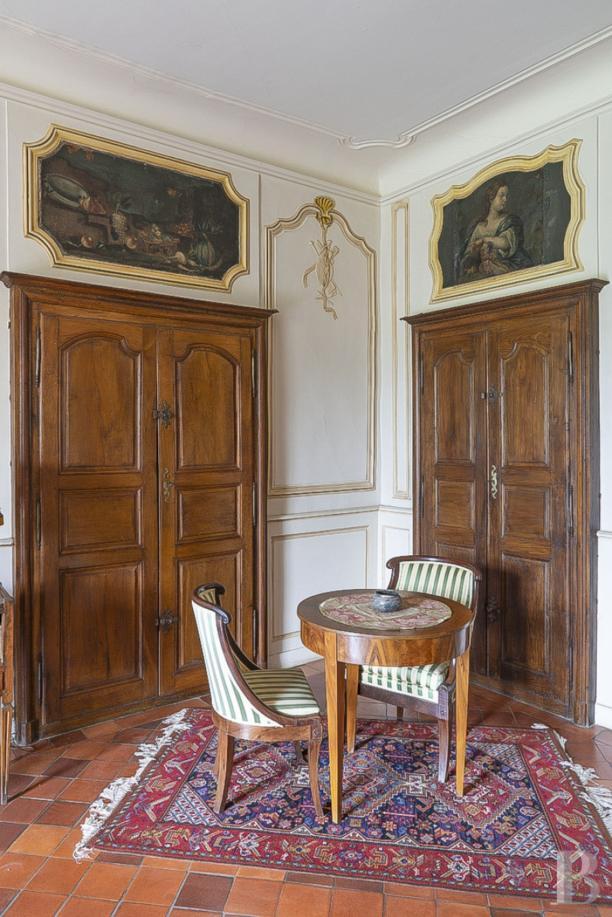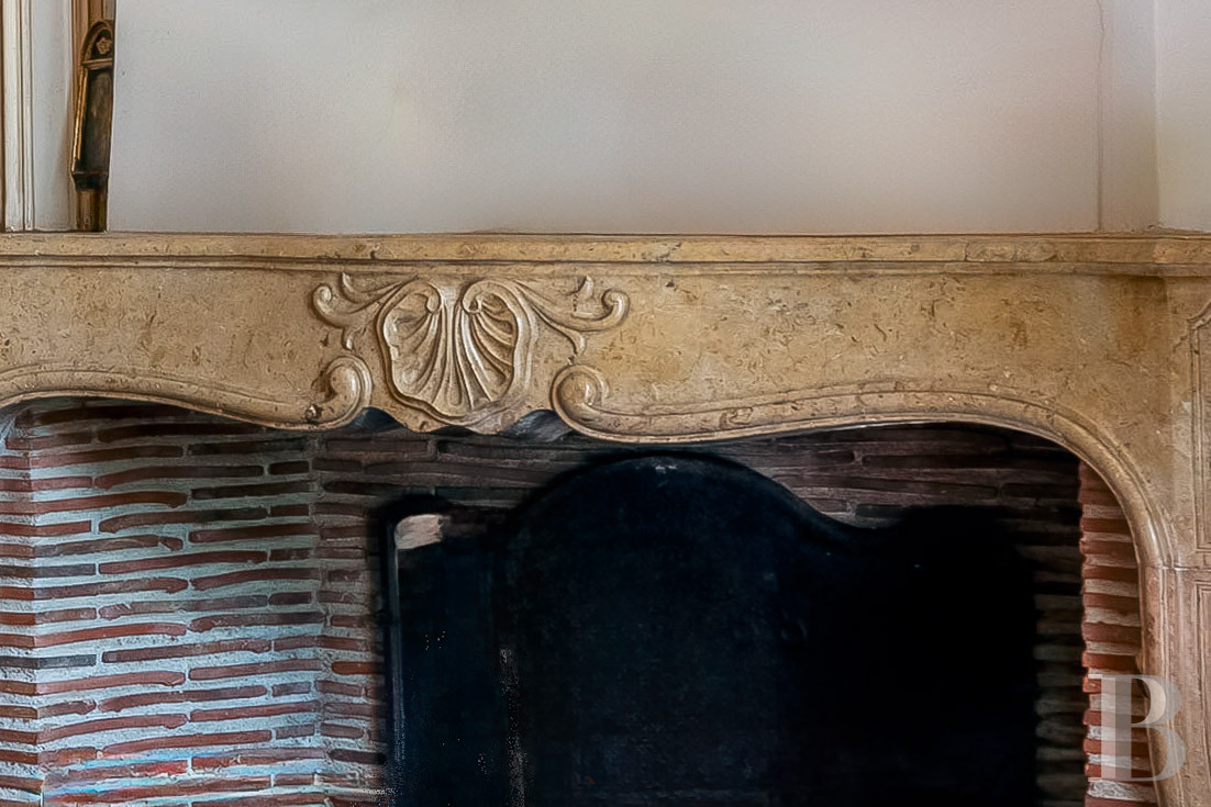 Accessible depuis le vestibule par deux hautes portes en chêne sculptées, le salon de réception illustre avec élégance le raffinement de l’art décoratif de l’époque. Entièrement restauré, celui-ci se distingue par ses gypseries représentant les allégories des arts et des métiers traditionnels : la musique, la chasse, l’architecture, les récoltes ; les murs sont rythmés par des boiseries de hauteur finement moulurées ; les dessus-de-porte sont ornés de toiles peintes anciennes et une imposante cheminée en marbre achève l’harmonie de la pièce. Le sol est revêtu de tomettes, le plafond plâtré et à corniches moulurées. Le tout, réalisé selon les codes esthétiques du 18ᵉ s., apporte une richesse ornementale remarquable.