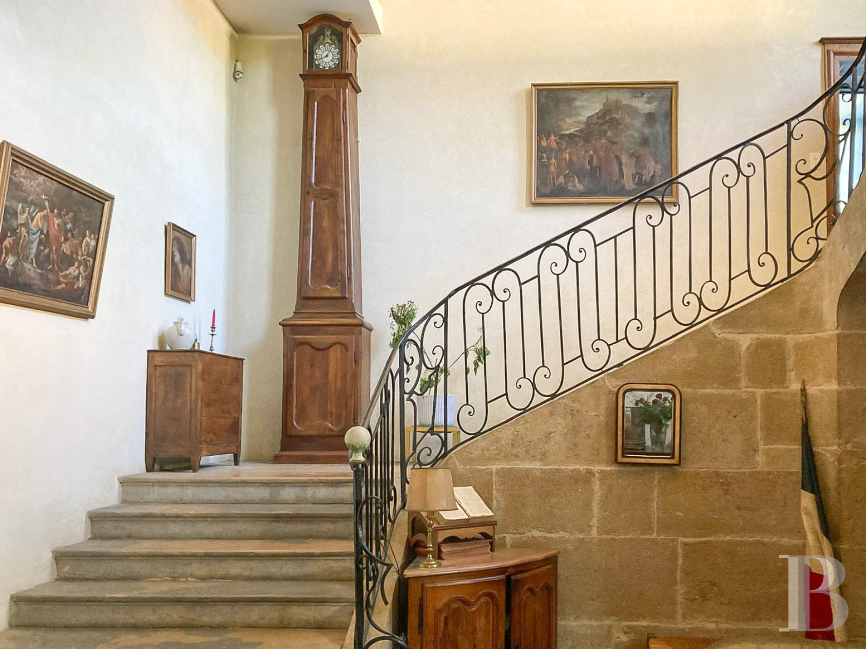 Au centre, un vaste vestibule ouvert jusqu'à l'étage est couvert au sol de dalles en pierre et dessert les différentes pièces de l’habitation. Un remarquable escalier en pierre à trois volées, souligné d'une rampe en fer forgé, conduit aux étages et constitue un élément architectural central, emblématique du 18ᵉ s.