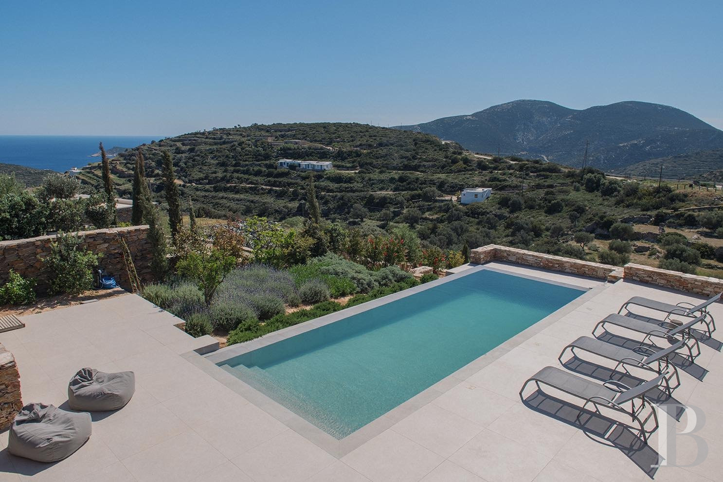 une villa en pierre avec deux maisons d'hôtes indépendantes face à la mer Égée