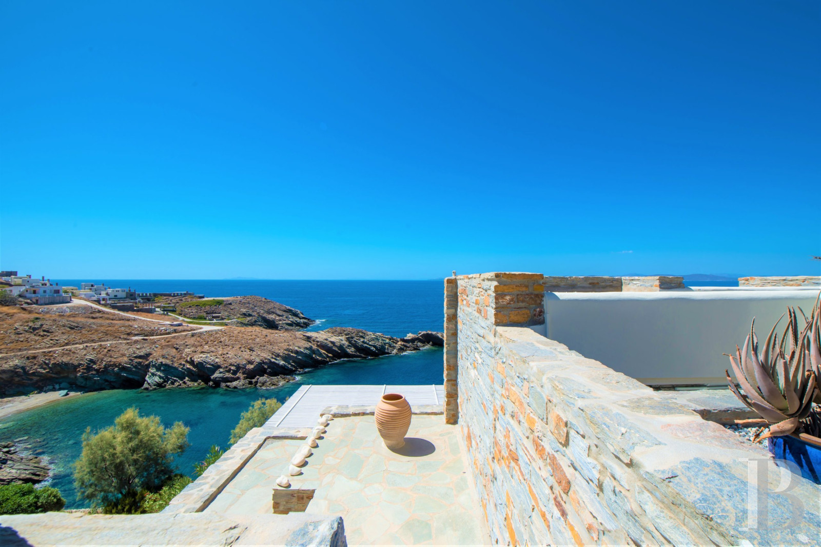Implantée dans un territoire marqué par les oliviers, les terrasses en pierre sèche et la mer Égée, une villa contemporaine adopte une architecture étagée sur deux niveaux, privilégiant le rapport aux perspectives maritimes et au relief plutôt qu'à l'effet de volume. Le parti des terrasses paysagées de 200 m² et l'orientation maîtrisée inscrivent le bâti dans une filiation avec les formes de l'habitat cycladique contemporain. L'organisation intérieure distingue clairement l'étage supérieur dévolu à la réception du niveau inférieur abritant cinq chambres et seconde cuisine, répondant à une manière d'habiter tournée vers l'indépendance et l'accueil étendu. Un domaine privé prolonge cette lecture territoriale en maintenant l'habitat en relation directe avec les paysages insulaires et les horizons maritimes. Entre villages traditionnels de l'intérieur et littoral aux criques préservées, une propriété qui s'inscrit dans une continuité d'usages qui donne au lieu une identité fondée sur la justesse de son implantation à Kea, île des Cyclades occidentales accessible en une heure depuis Athènes, et la permanence de son rapport à la mer.