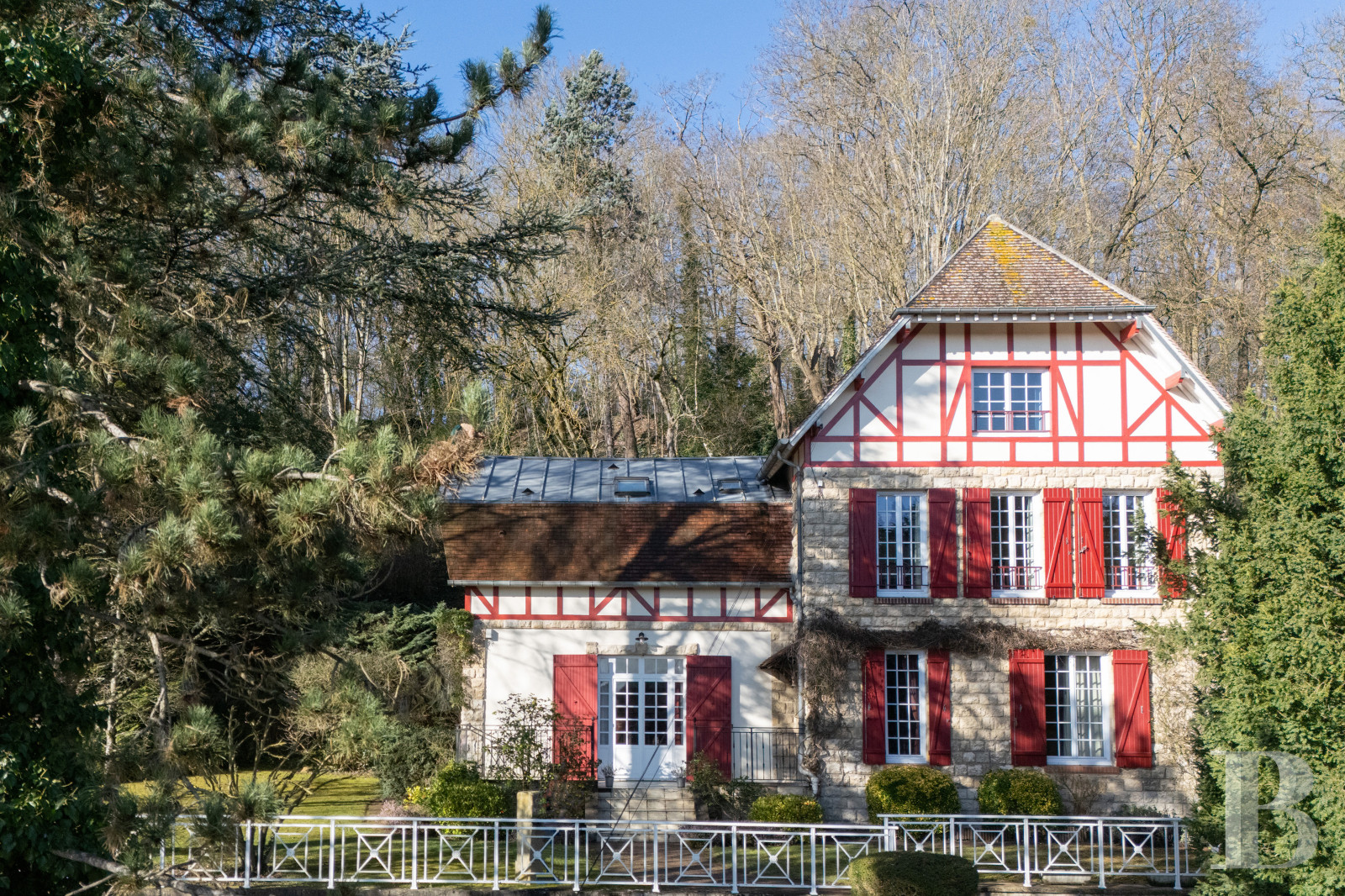 Une maison de maître anglo-normande du début du 20e s., peu représentée dans le secteur, dont les colombages et les volets rouges composent une silhouette singulière, presque intemporelle, en dialogue avec le jardin et le paysage environnant. L’organisation intérieure, claire et fonctionnelle, a conservé de nombreux éléments d’origine qui participent à l’atmosphère de la demeure. Baignées de lumière, les pièces donnent largement sur la nature et la vallée, sans vis-à-vis direct. Le calme, la dominante boisée du terrain et la position en surplomb renforcent un sentiment d’isolement, sans être synonyme d’éloignement. Une demeure au caractère affirmé, adaptée aussi bien à une vie familiale qu’à l’usage d’une résidence secondaire, avec l’avantage d’une proximité immédiate de Paris.