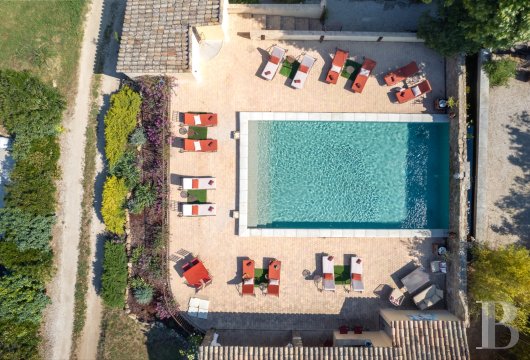 Ce qui rend la propriété singulière tient d’abord à son ancienneté : une ferme provençale du 18e siècle, déjà portée sur le plan napoléonien du début du 19e, avec ses deux ailes déployées comme pour embrasser la cour. Mais sa véritable étrangeté naît du rocher contre lequel elle s’adosse, et qui la traverse de part en part. Jadis réservé aux bêtes, aux granges et à la fraîcheur de la cave, il demeure la colonne vertébrale minérale de la maison. L’habitat s’est construit à son flanc, en pierre locale, à la chaux, dans une fidélité aux matières simples. Au sol, la pierre de Beaulieu ; aux murs, parfois, la calade de galets dressés. Ici, tout procède de la terre même, et la demeure semble née du paysage plus que bâtie par la main des hommes.
